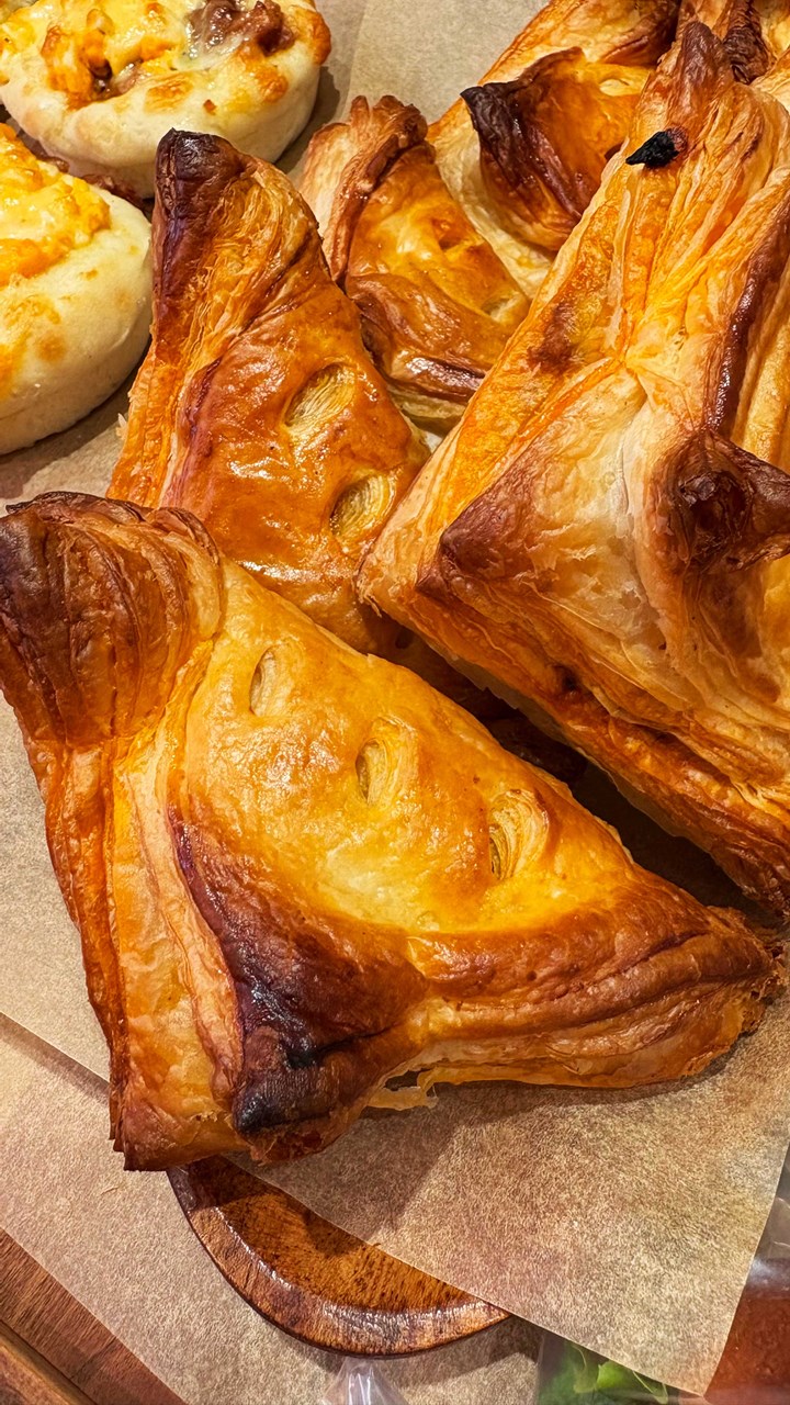 肌寒くなってきたこの季節にぴったりの「季節限定ミートパイ」が、焼きたてで皆様をお迎えします。一口食べれば、サクサク香ばしいパイ生地の層が心地よく広がり、中からは厳選した合いびき肉、玉葱、ベーコンをトマトでじっくり丁寧に煮込んだ、当店自慢の自家製フィリングがとろけ出ます。旨みが凝縮された温かい味わいは、心と体を優しく満たすはず。焼きたての香りに誘われ、ぜひこの毎年人気の商品をご堪能ください。